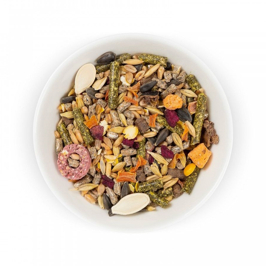 Склад: овес, пшениця, ячмінь, горіхи, родзинки, насіння гарбуза, соняшнику та льону, плющення кукурудза і горох, зневоднені овочі і фрукти (морква, буряк, картопля, яблуко), спеціалізований гранулят для гризунів (овес, пшениця, ячмінь, кукурудза, насіння гарбуза і льону, трав'яна мука, пшеничні висівки), злаково-овочевий гранулят (трав'яне борошно, буряк, морква, злаки, макуха, висівки), ріжкове дерево (кероб), гранульована трав'яна суміш (люцерна, лугові трави).