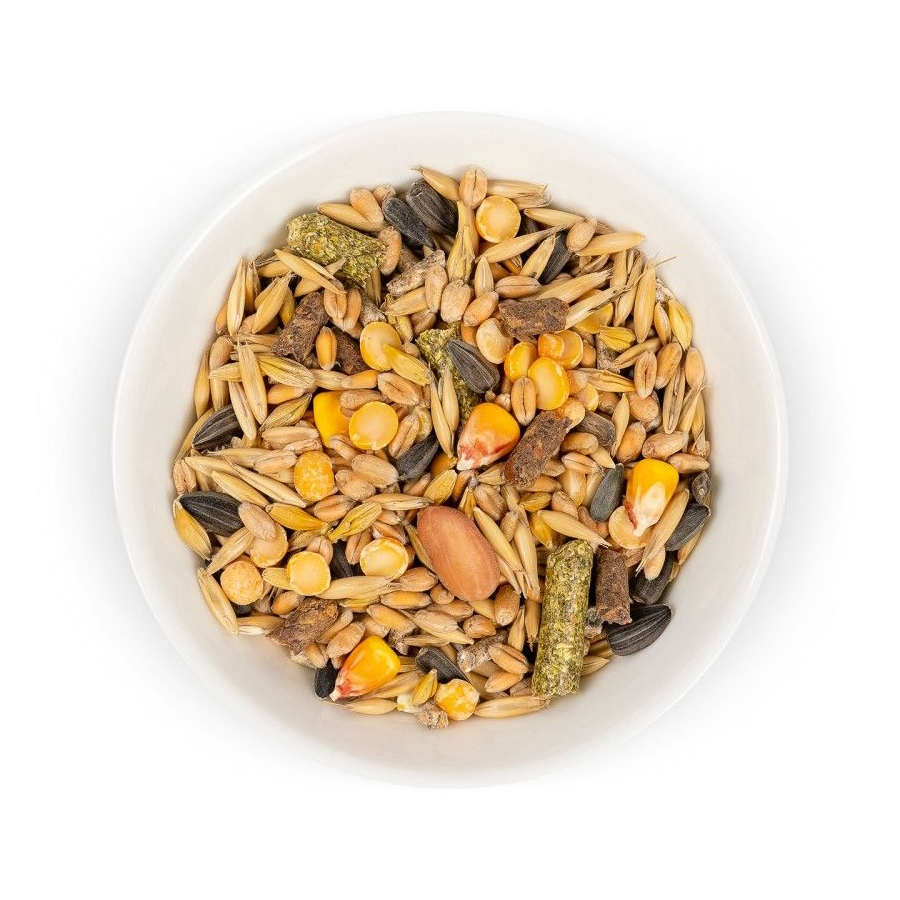 Склад: горохова крупа, комбікорм, кукурудза, овес, вівсяні пластівці, арахіс, насіння соняшнику, яблука сушені гранульовані, ячмінь, пшениця, злаково-фруктовий гранулят, трав’яне борошно гранульоване в асортименті.