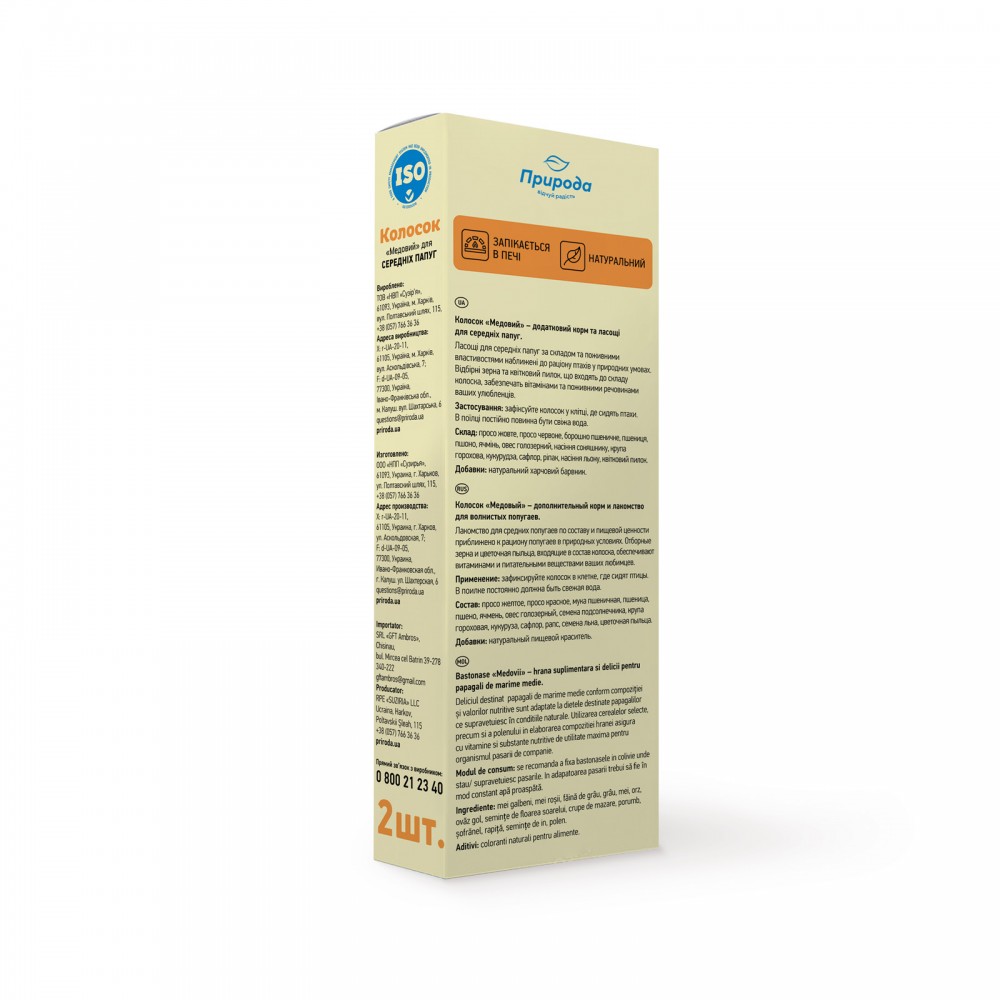 Каталог товаров : Ласощі, колоски для птахів > Ласощі колоски для середніх папуг Природа медовий 2шт, 140г