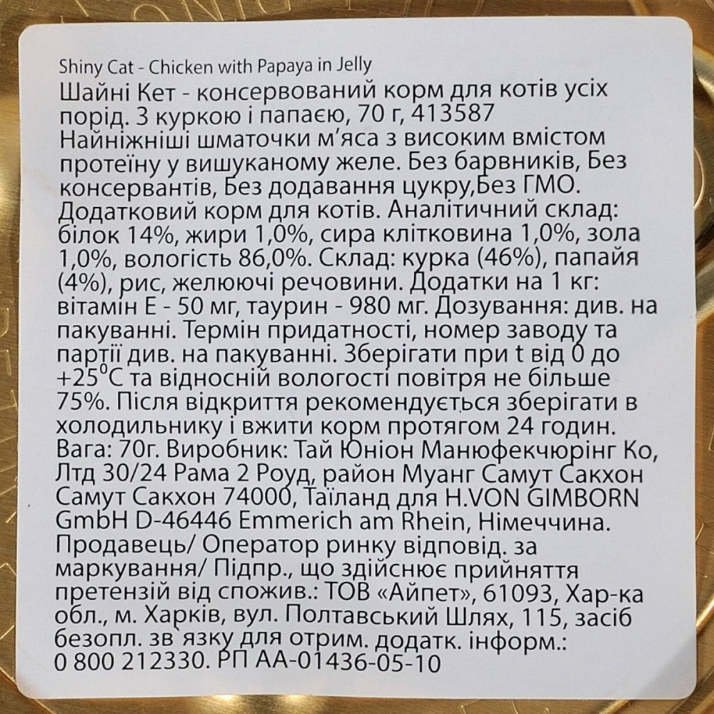 Консерви для котів Shiny Cat курка з папаєю – делікатесний вологий корм, готовий до споживання. Виготовлений з високоякісного м’яса курки. Не містить штучних барвників, підсилювачів смаку, консервантів і ГМО.