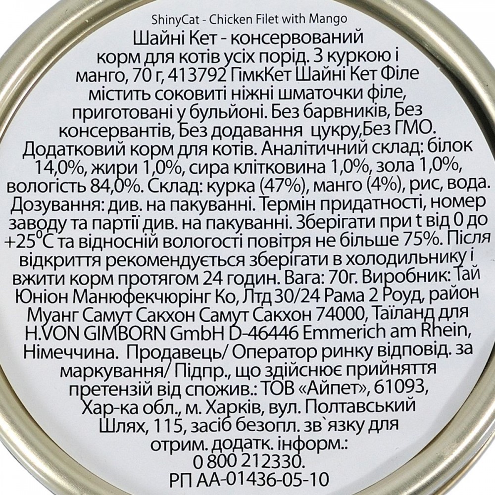 Shiny Cat Filet курка та манго – це ніжні та соковиті шматочки курячого філе, приготовані в бульйоні, з додаванням манго та рису. Вологий корм суперпреміум класу для котів, збагачений протеїнами, не містить штучних барвників, ароматизаторів, підсилювачів смаку, генно модифікованих складових, консервантів.