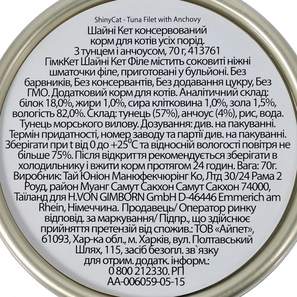 Каталог товаров : Консерви для котів > Вологий корм для котів GimCat Shiny Cat з тунцем та анчоусом 70г