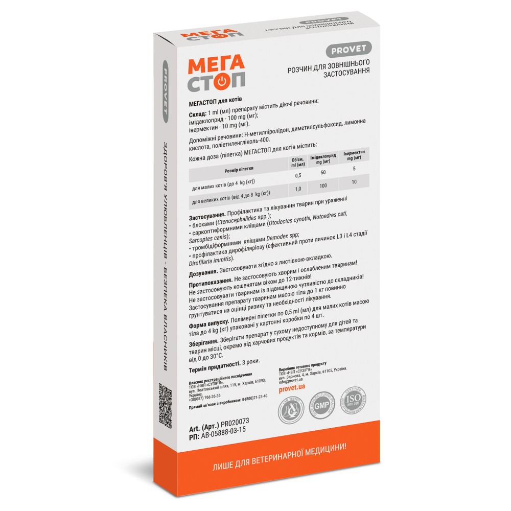 Каталог товаров : Препарати від паразитів для котів > Краплі ProVET Мега Стоп від бліх, кліщів та гельмінтів для котів до 4кг, 4 піпетки