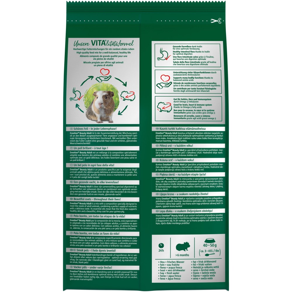 Соковитий буряк, багата клітковиною люцерна, ароматна петрушка - в Emotion Beauty Selection Adult зібрано все найсмачніше і корисне для морських свинок. Склад корму підібраний спеціально для дорослих морських свинок і містить метіонін для росту шерсті. Корисні олії сприяють блиску шерсті і здоров'ю шкіри.