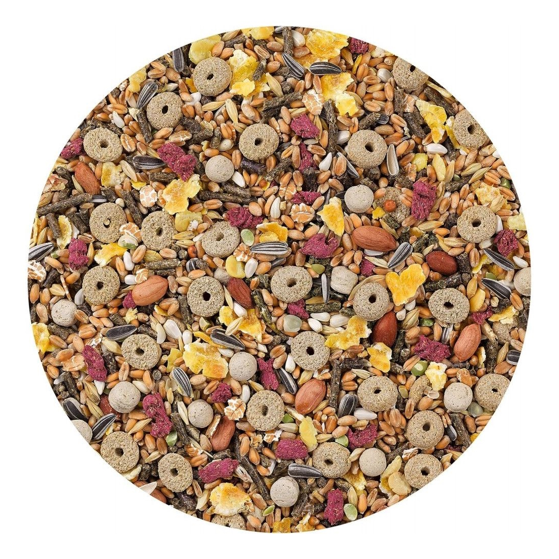Склад: злаки 66,6%, побічні продукти овочів, насіння (насіння соняшнику 2%), овочі (горох сушений 1,3%, буряк сушений 0,16%), мінеральні речовини, горіхи (ядра арахісу 1,3%), листя м'яти перцевої сушені 0,9%, чебрець сушений 0,6%, олії та жири, квітки ромашки сушені 0,3%, квітки гібіскуса 0,2%, екстракт юки Шидигера.