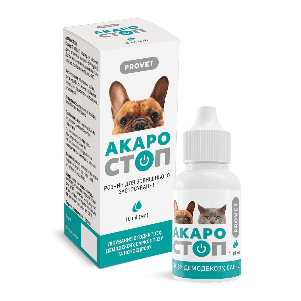 Описание: Препарат ефективний при отодектозі, саркоптозі, нотоедрозі, демодекозі. До складу препарату входить амітраз - акарицид групи амідинів, активний щодо саркоптоїдних кліщів (Оtodektes sрр., Рsoroptes, Notoedres cati), а також Demodex sрр. Амітраз діє контактно, порушуючи октопамінрецептори нервової системи кліщів, що викликає параліч та загибель паразитів, негативно діє на репродуктивні органи самок кліщів, зменшуючи продукування яєць та їхню життєздатність.