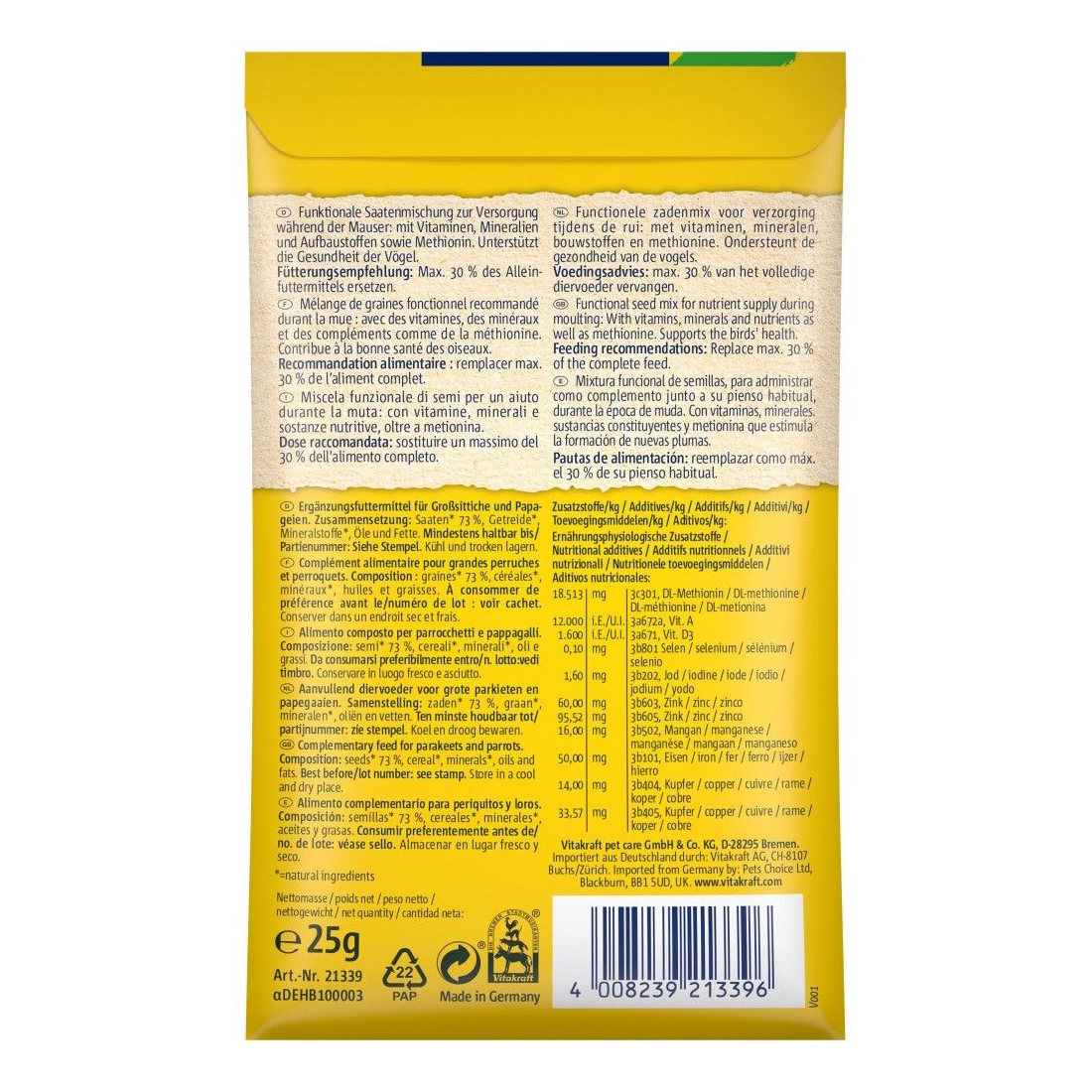 Вітамінізована суміш для великих і середніх папуг у період линьки. Піклується про птаха у період виростання пір'я, забезпечуючи життєво важливими вітамінами, мінералами і відновлюваними речовинами, що призводить до швидкої та безболісної зміни оперення.