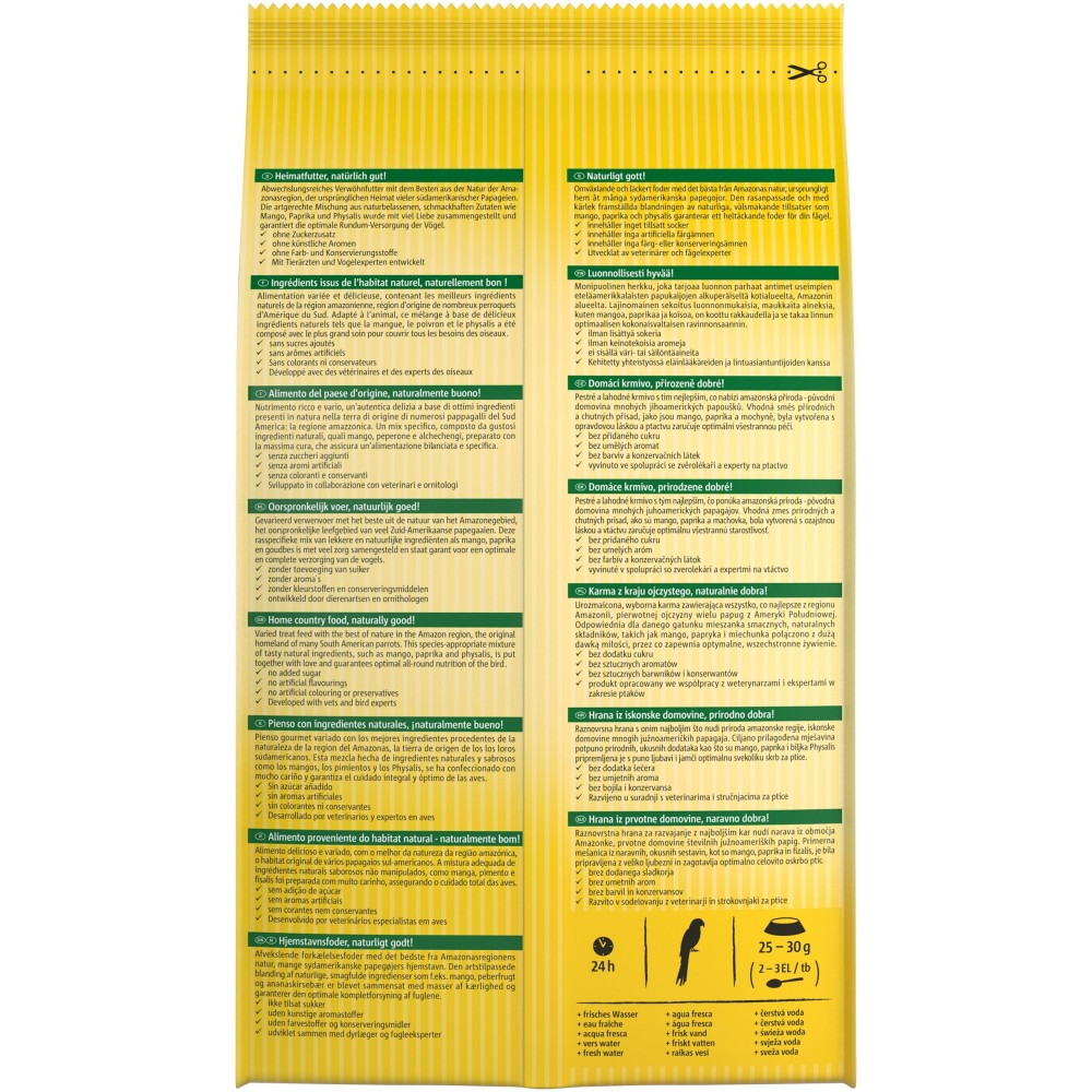 Склад корму відповідає раціону птаха в природному середовищі існування. Батьківщиною багатьох американських птахів є Амазонія, тому корм містить суміш таких інгредієнтів як манго, солодкий перець, фізаліс. Крім основних інгредієнтів, корм містить вітаміни й інші поживні речовини, які необхідні великим птахам для здорового способу життя.
