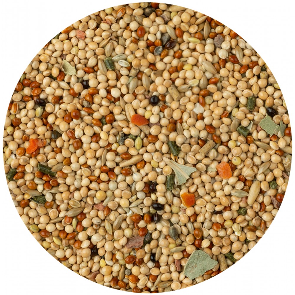 Високоякісні зернові, насіння соняшнику, листя евкаліпта та шматочки моркви - ідеально підходять для задоволення основних потреб хвилястих папуг у харчуванні. Всі основні вітаміни, мінерали та мікроелементи сприяють оптимального стану птаха. Завдяки корисному меду і риб'ячому жиру смак корму стає більш привабливий для птаха.