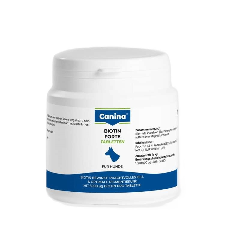 Сбалансированная кормовая добавка с высоким содержанием биотина и витаминов В группы для собак. Была разработана специально для животных, которым не хватает биотина. Первыми признаками этого является сухая, ломкая шерсть с отсутствием блеска, перманентная лень, перхоть, зуд. Canina «Biotin Forte» помогает преодолеть эту недостачу, и придать шерсти питомца блеск и здоровье.