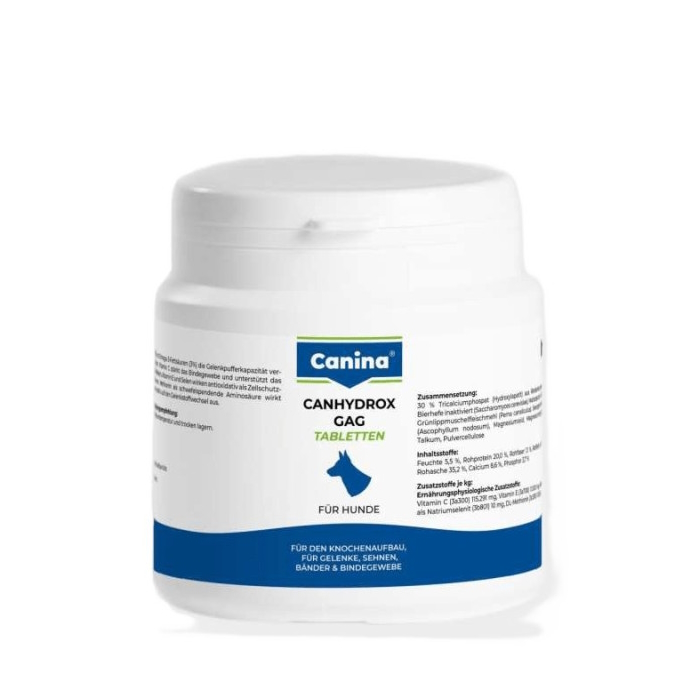 CANINA® CANHYDROX GAG был специально разработан для больших и тяжелых пород собак. Он обеспечивает высококачественное питание соединительной ткани, суставов, костей, сухожилий, связок, хрящей и зубов. Молодые собаки, а также работающие и стареющие собаки получают пользу от этого «универсального» продукта для опорно-двигательного аппарата!