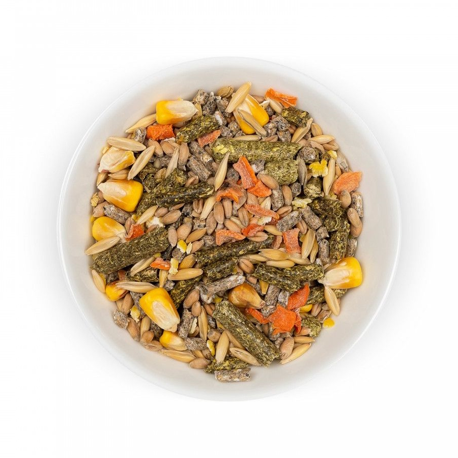 Склад: пшениця, трав’яне борошно гранульоване в асортименті, овес, кукурудзяні пластівці, комбікорм, сушена морква, ячмінь, насіння соняшнику, кукурудза.