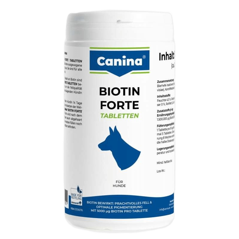 Сбалансированная кормовая добавка с высоким содержанием биотина и витаминов В группы для собак. Была разработана специально для животных, которым не хватает биотина. Первыми признаками этого является сухая, ломкая шерсть с отсутствием блеска, перманентная лень, перхоть, зуд. Canina «Biotin Forte» помогает преодолеть эту недостачу, и придать шерсти питомца блеск и здоровье.