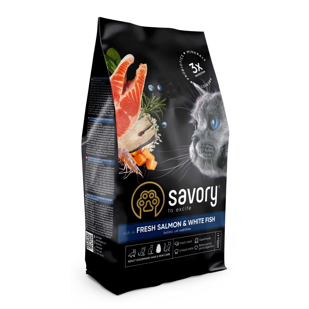 Каталог товаров : Сухий корм для котів > Сухой корм Savory Adult Cat Gourmand для длинношерстных котов с лососем и белой рыбой 400г