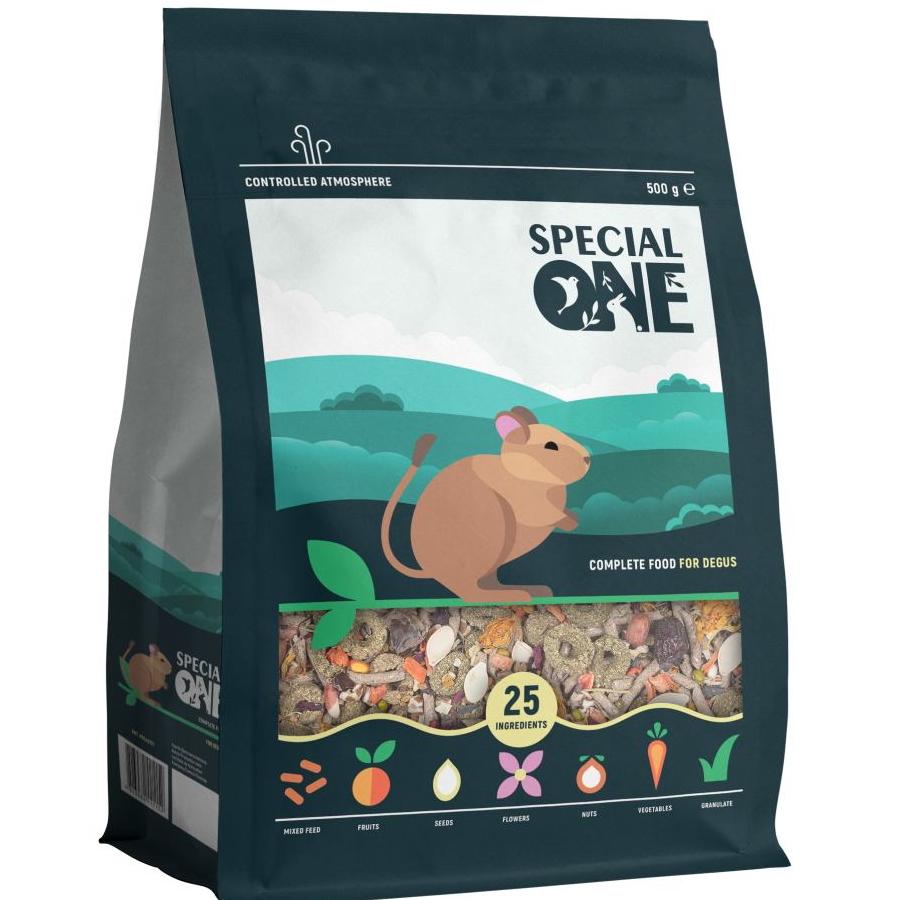 Рецептура корму розроблена спеціально для дегу, які утримуються в домашніх умовах. Вона складена на основі найновітніших світових норм годування, а також рекомендацій провідних світових фахівців з розведення та утримання дегу.