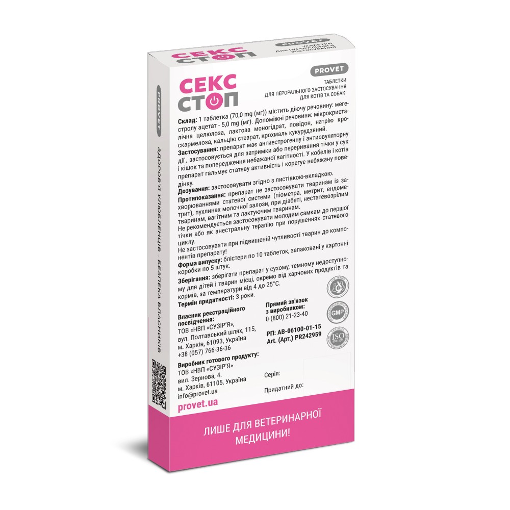 Описание: Препарат має антиестрогенну і антиовуляторну дії і застосовується для затримки або переривання тічки у сук і кішок та попередження небажаної вагітності. У кобелів і котів препарат гальмує статеву активність і корегує небажану поведінку. Препарат добре абсорбується із травного каналу, метаболізується у печінці і виводиться з організму, в основному, із сечею протягом 1-2 діб.