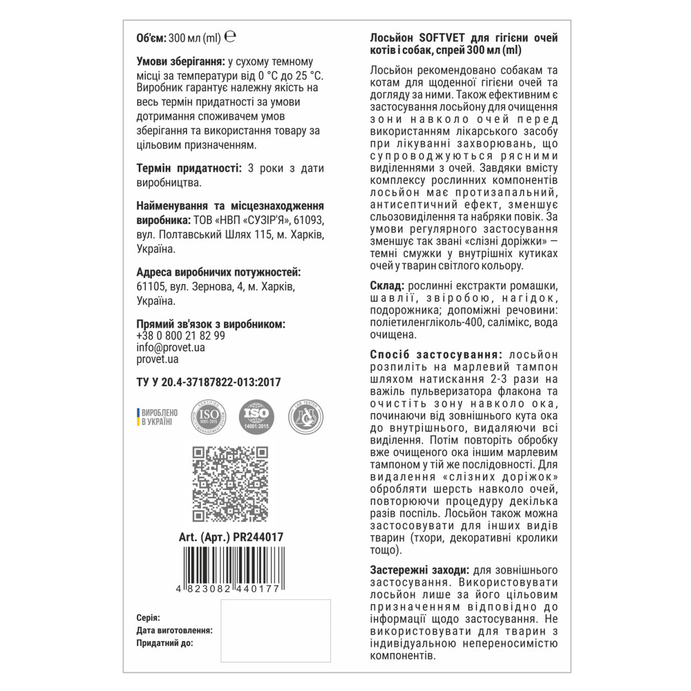 Лосьйон для гігієни очей котів і собак PROVET SOFTVET спрей 300мл