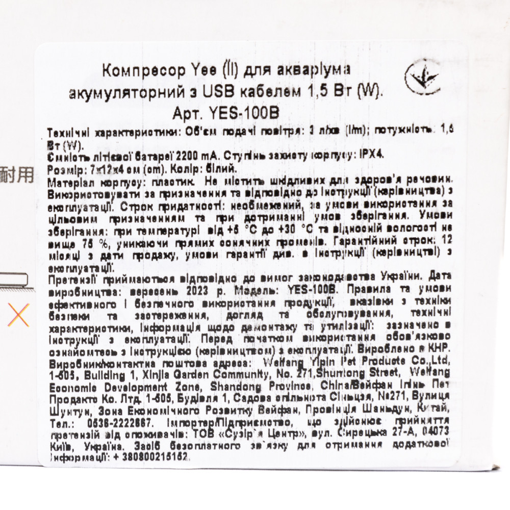 Безшумний акумуляторний компресор YEE з живленням від USB кабелю. Подвійний режим подачі кисню, безперервний (35 годин) та з перервами (70 годин). Може працювати під час зарядки. Система захисту живлення для запобігання перезарядки. Кнопка для перемикання режиму роботи, відповідно до необхідного режиму.