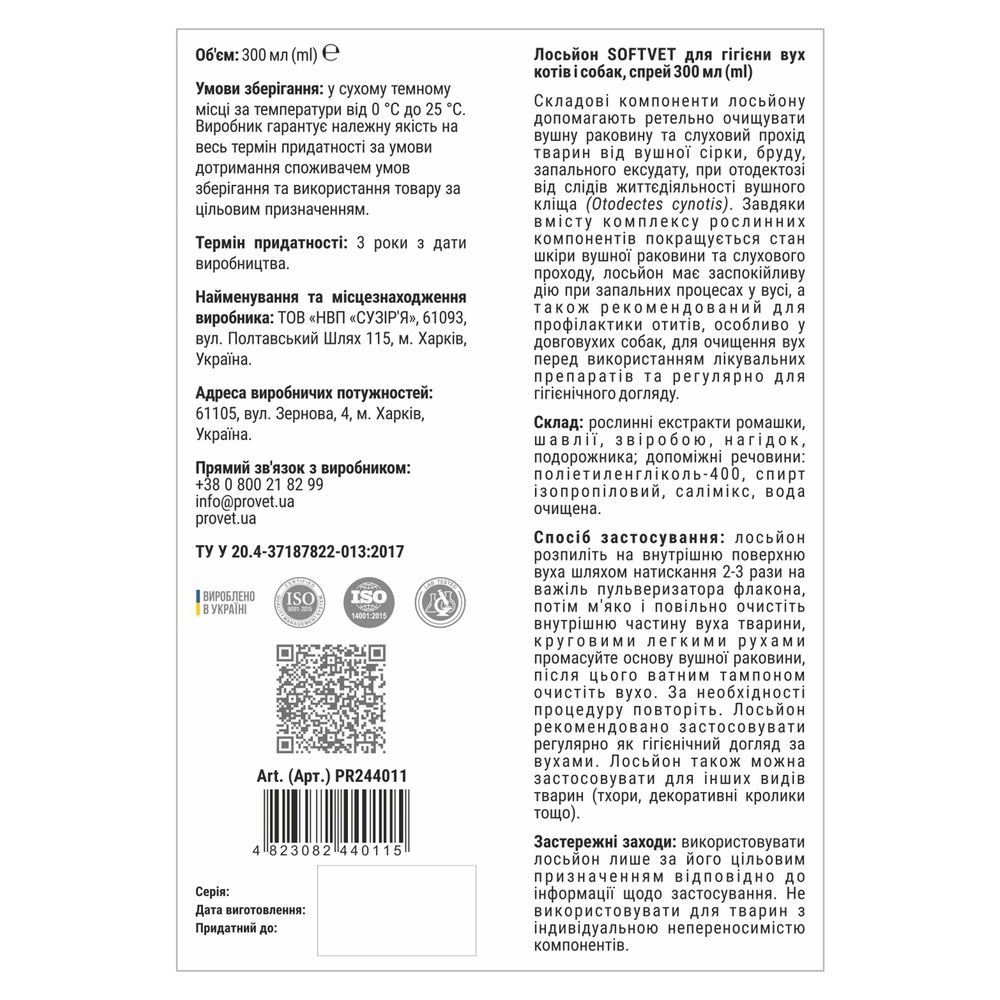 Складові компоненти лосьйону допомагають ретельно очищувати вушну раковину та слуховий прохід тварин від вушної сірки, бруду, запального ексудату, при отодектозі від слідів життєдіяльності вушного кліща (Otodectes cynotis). Завдяки вмісту комплексу рослинних компонентів покращується стан шкіри вушної раковини та слухового проходу, лосьйон має заспокійливу дію при запальних процесах у вусі, а також рекомендований для профілактики отитів, особливо у довговухих собак, для очищення вух перед використанням лікувальних препаратів та регулярно для гігієнічного догляду. Склад: рослинні екстракти ромашки, шавлії, звіробою, нагідки, подорожника; допоміжні речовини: поліетиленгліколь-400, спирт ізопропіловий, салімікс, вода очищена. Спосіб застосування: нанесіть невелику кількість лосьйону (до легкого зволоження) на ватний тампон, м'яко і повільно очистіть внутрішню частину вуха тварини, круговими легкими рухами промасуйте основу вушної раковини, а після цього ватним тампоном очистіть вухо. За необхідності процедуру повторіть. Лосьйон рекомендовано застосовувати регулярно як гігієнічний догляд за вухами. Лосьйон також можна застосовувати для інших видів тварин (тхори, декоративні кролики тощо). Застережні заходи: використовувати лосьйон лише за його цільовим призначенням відповідно до інформації щодо застосування. Не використовувати для тварин з індивідуальною непереносимістю компонентів.