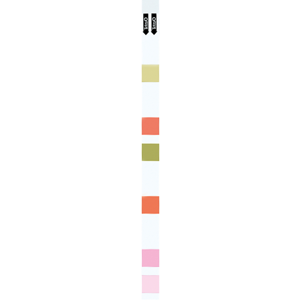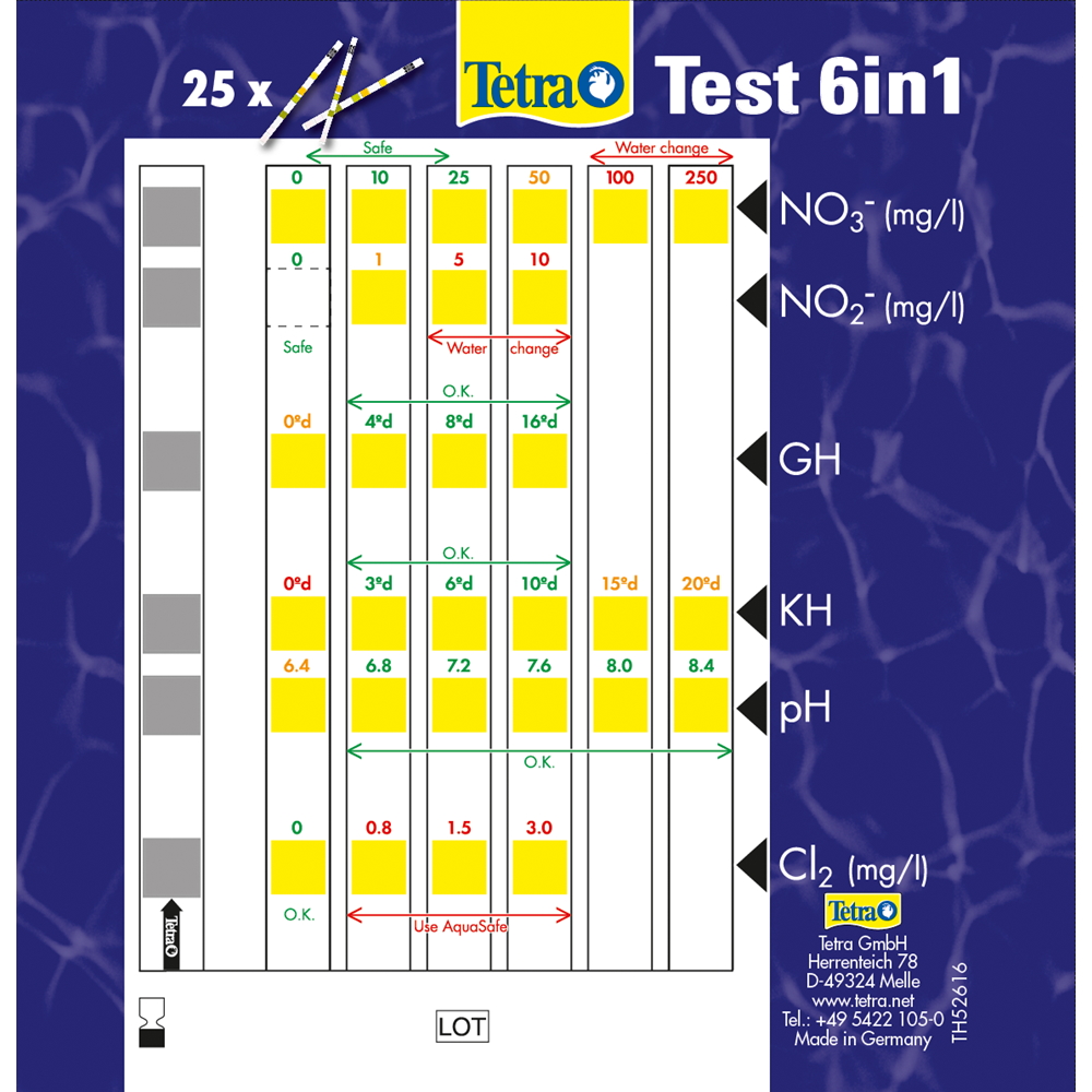 Тестовые полоски Тетра позволяют быстро и точно определить шесть наиболее важных показателей воды в аквариумах за одну простую процедуру. Окуните тестовую полоску в воду, поводите ею пару секунд в воде, стряхните воду, и уже через 60 секунд вы узнаете значения главных показателей воды. Чтобы определить, входят ли полученные значения в диапазон безопасных, используется таблица цветов. Тестовая полоска позволяет определить уровень pH, карбонатную и общую жесткость (KH и GH), содержание нитритов (NO2–), нитратов (NO3–) и хлора (Cl2) в аквариумной воде. Обитатели аквариума, например рыбы, очень чувствительны к значительным и быстрым изменениям уровня pH, что пагубно влияет на их здоровье. От общей жесткости зависят жизненно важные функции организма рыб, а от карбонатной жесткости — непосредственно стабильный уровень pH (буферный раствор). Тестовые полоски также позволяют определить содержание нитритов и нитратов в аквариуме. Вред нитрита чрезвычайно велик даже при низких его концентрациях, поэтому его обнаружение в воде абсолютно недопустимо. Нитрат — это питательное вещество, которое способствует росту растений. Однако значительно повышенный уровень NO3– может нанести вред рыбам и привести к избыточному росту водорослей. Хлор также может содержаться в воде, действуя на рыб и растения губительным образом. Как и в случае с нитритом, обнаружение хлора в аквариумной воде абсолютно недопустимо. Приложение Тетра Акватикс поможет быстро и точно определить показатели воды с помощью смартфона.